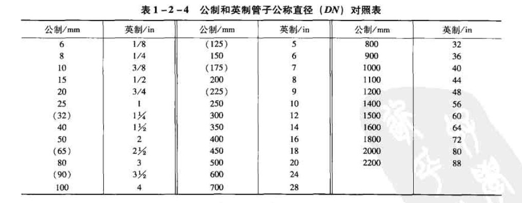 公称直径有公制(SI)和英制两种。在两种制度中的无缝钢管具体尺寸和相应的螺纹尺寸是一致的。公制和英制的管子公称直径对照如表1-2-4所示。