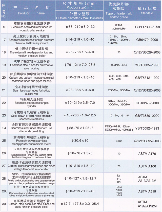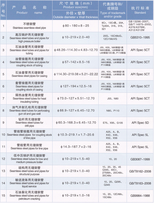 企业坚持追求技术创新和结构调整高水平的发展理念,近年来,为满足国内外市场需求,投资6亿元,引进了德国、美国及国内先进技术装备和管理模式,进行了大规模的技术创新和产品结构调整,已形成热轧和冷拔管二大系列、30多个品种、1000多个规格、年产40万吨以上无缝钢管生产能力,以及以被命名为天津市名牌产品的石油油管、石油套管、管线管、钻杆管为主导产品,以低中压锅炉管、高压锅炉管、不锈钢管、液压支柱管、汽车半轴套管、船舶用管、流体输送管、结构管、石油裂化管、建筑用管等为基础产品的结构调整大格局,产品规格覆盖Φ10~244.5×1.0~45mm,广泛应用于油田、石化、机械、矿山、电力、汽车、船舶及锅炉制造等行业。