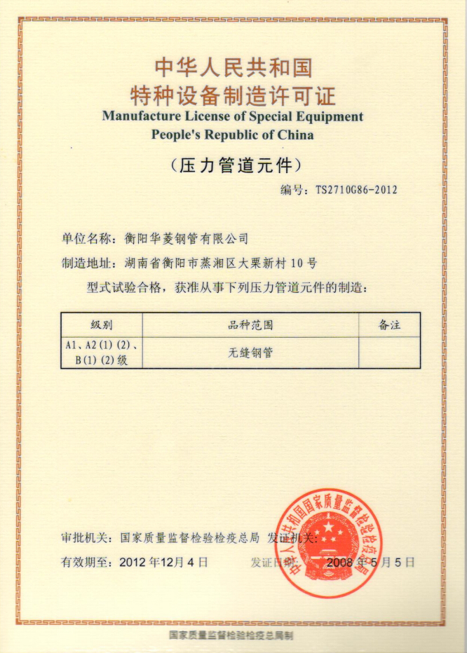 关于无缝钢管的压力管道元件制造许可项目及其级别表